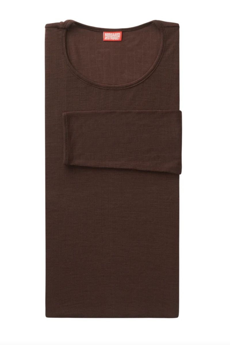 101 Wool er den originale #101 T-shirt i en ensfarvet 100% merinould-kvalitet fra Nørgaard på Strøget i brun. Nørgaard paa Strøgets #101 T-shirt er designet i 1967 af Jørgen Nørgaard.T-shirten er strikket, farvet og syet i Danmark og lavet i 100% uld.