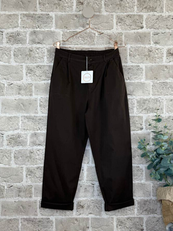 Lækker brun twill buks i bomuld fra Cabana Living. Buksen har vidde og bæltestropper. Derudover har den også elastik på det bagerste af linningen.