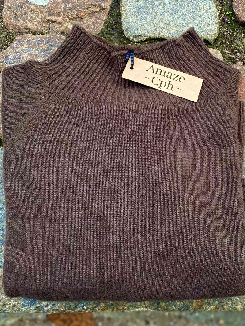 Lækker blød striktrøje fra Amaze Cph. Striktrøjen er lavet med 3/4 ærmer som bliver bredere i enden. Den har en høj krave, ribbede kanter og er perfekt til din efterårsgarderobe.