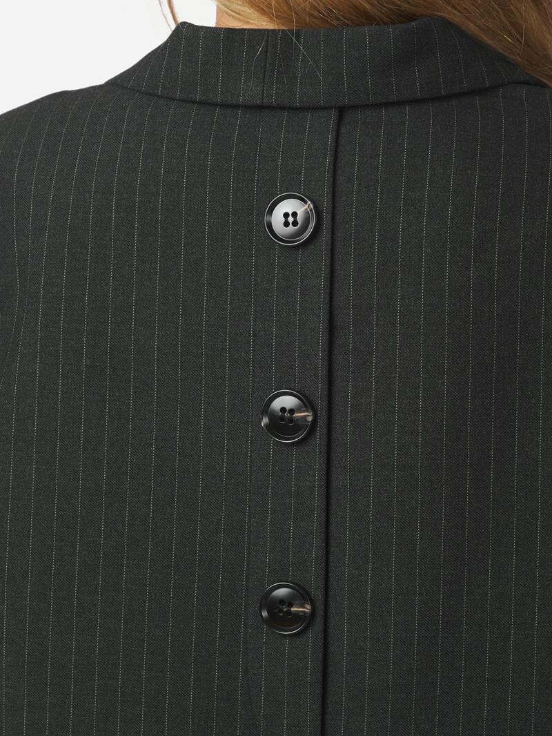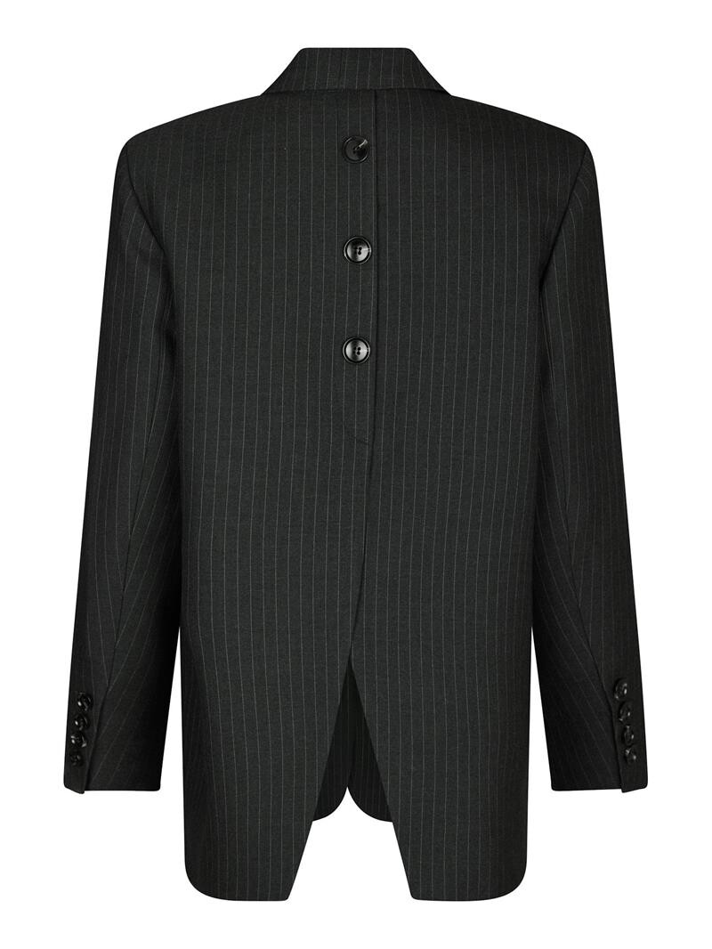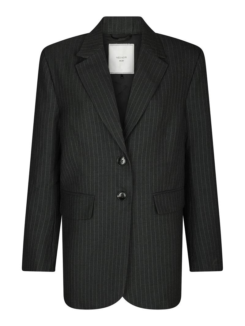 Elegant blazer kombinerer klassisk design med moderne detaljer fra Neo Noir. Den har en løstsiddende pasform, lange ærmer og en traditionel reverskrave, der giver et stilfuldt og sofistikeret look. Blazeren har en unik knapdetalje på ryggen, som tilfører et spændende og iøjnefaldende element til det ellers klassiske design. Blazeren er en mørkegrå farve med hvide små striber lodret ned. virkelig en flot blazer.