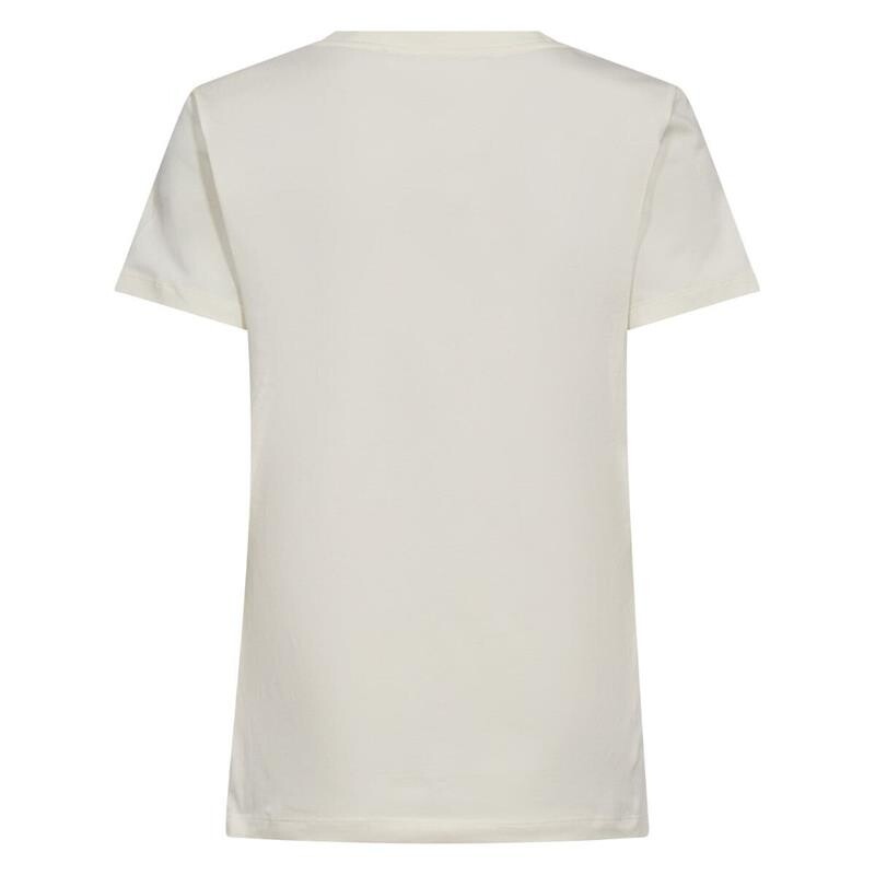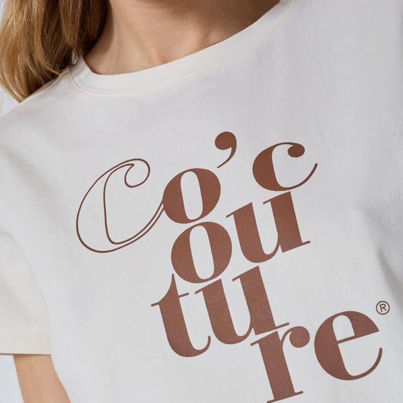 Lækker bomulds T-shirt fra Co'couture. T-shirten er i en flot creme farve med et brunt Co'couture logo trykt på fronten. Den har rund halsudskæring og korte ærmer. Perfekt til basis garderoben.