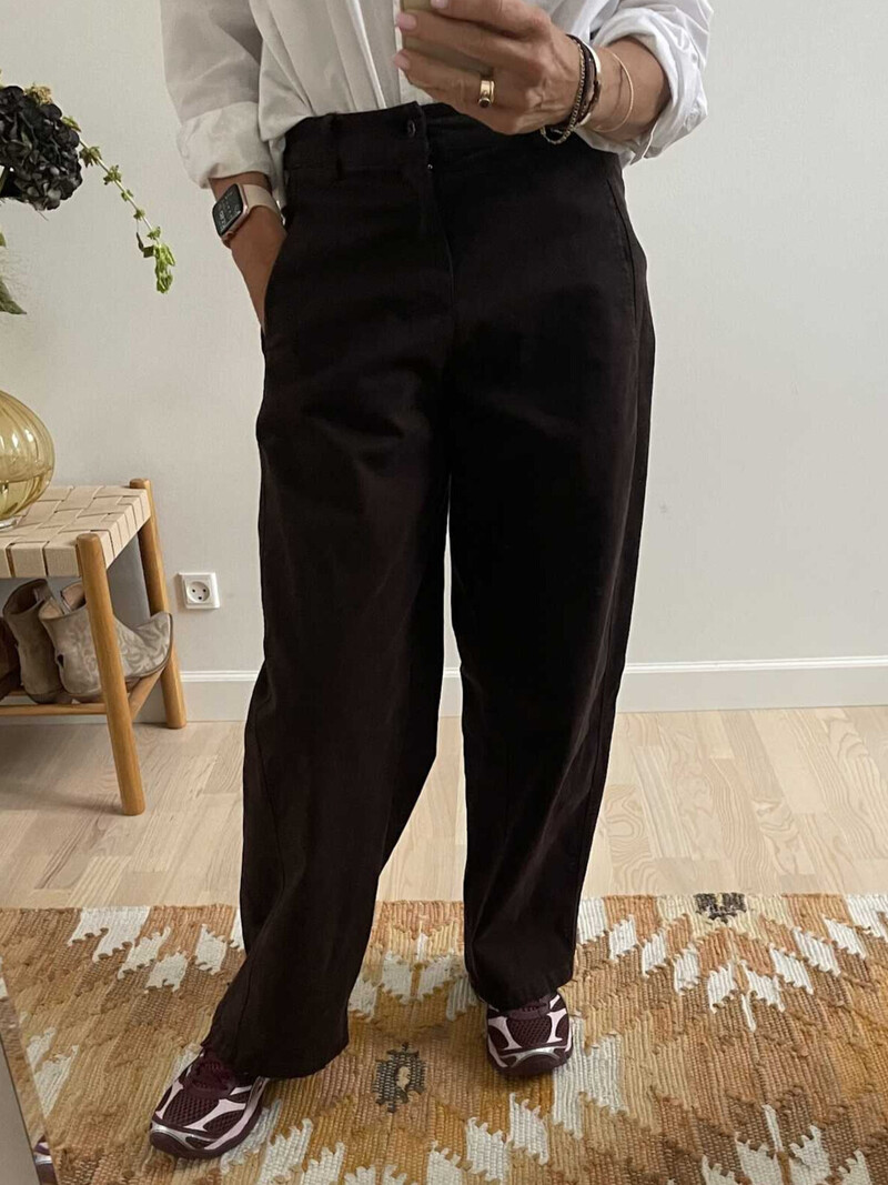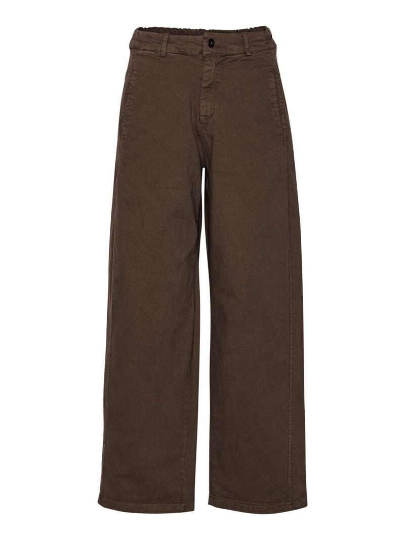 Smarte bukser fra Amaze Cph. Bukserne er designet med brede ben, sidelommer og påsyede baglommer. De har bæltestropper og elastik i taljen og lukkes med en knap og lynlås.