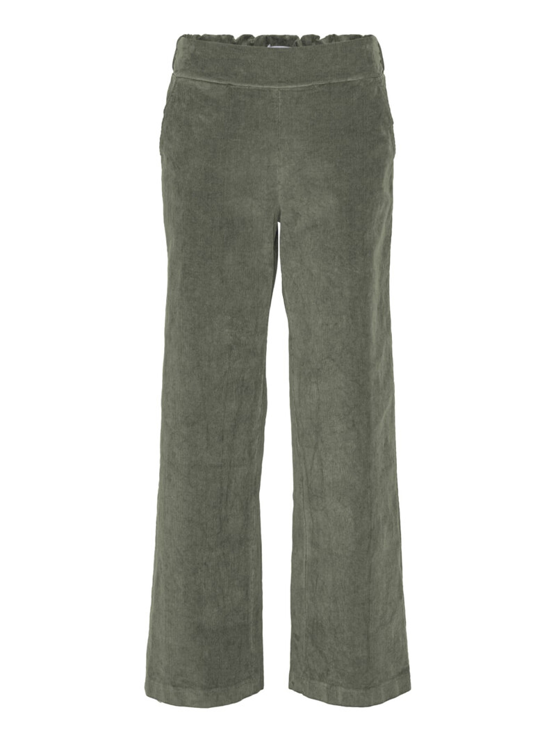 Smarte bukser fra Amaze Cph. Bukserne er lavet i ribbet babyfløjl, med brede ben og elastik i tajlen. De har lommer i siderne og paspolerede lommer bagpå.