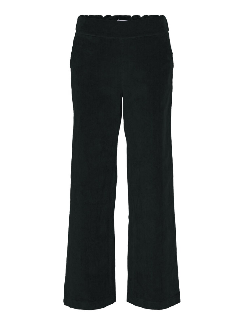 Smarte bukser fra Amaze Cph. Bukserne er lavet i ribbet babyfløjl, med brede ben og elastik i tajlen. De har lommer i siderne og paspolerede lommer bagpå.