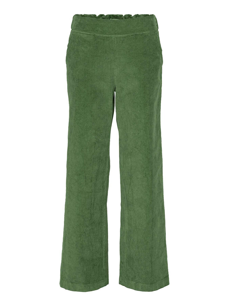 Smarte bukser fra Amaze Cph. Bukserne er lavet i ribbet babyfløjl, med brede ben og elastik i tajlen. De har lommer i siderne og paspolerede lommer bagpå.