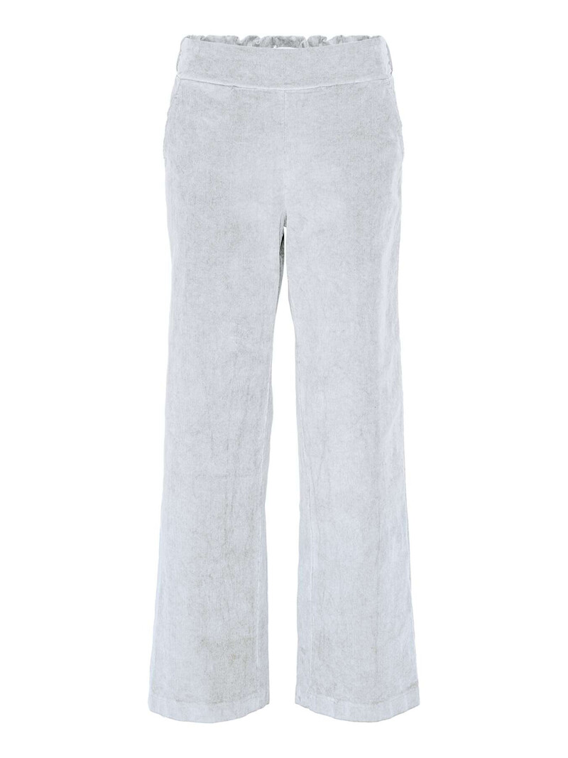 Smarte bukser fra Amaze Cph. Bukserne er lavet i ribbet babyfløjl, med brede ben og elastik i tajlen. De har lommer i siderne og paspolerede lommer bagpå.