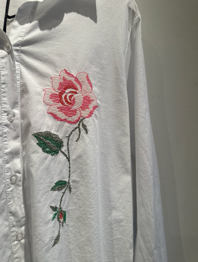 Smuk klassisk skjorte fra Amaze Cph. Skjorten har et fint broderi foran som tilføjer et feminint og unikt præg til dit outfit. Den har lange ærmer, en klassisk skjortekrave, knaplukninger og en afslappende pasform.
