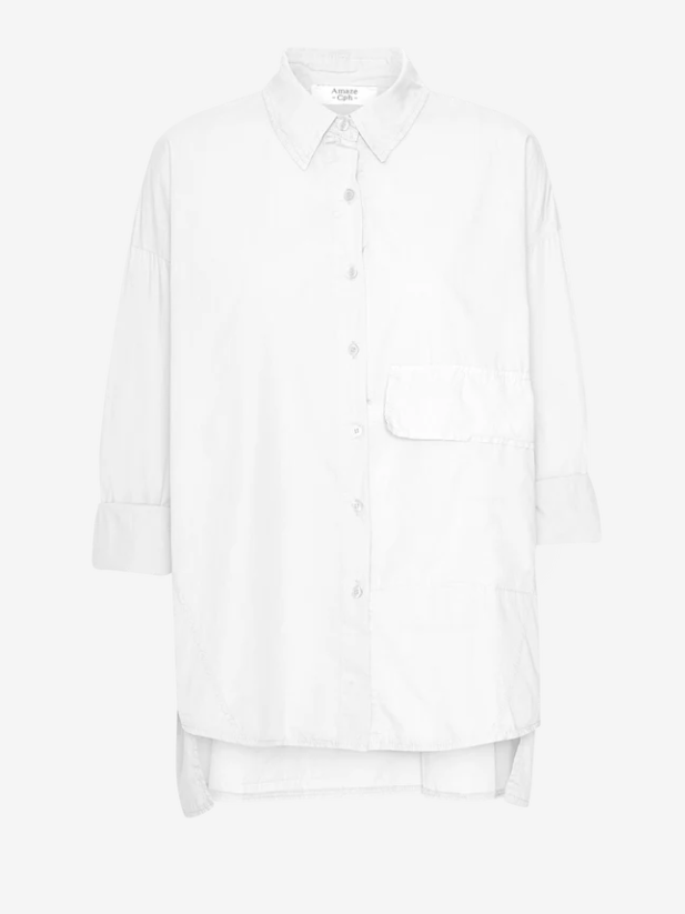 Smart skjorte fra Amaze. Sylvia skjorten fra Amaze Cph er en klassisk skjorte i hvid med krave og knaplukning. Den har en stor lomme foran med klap.