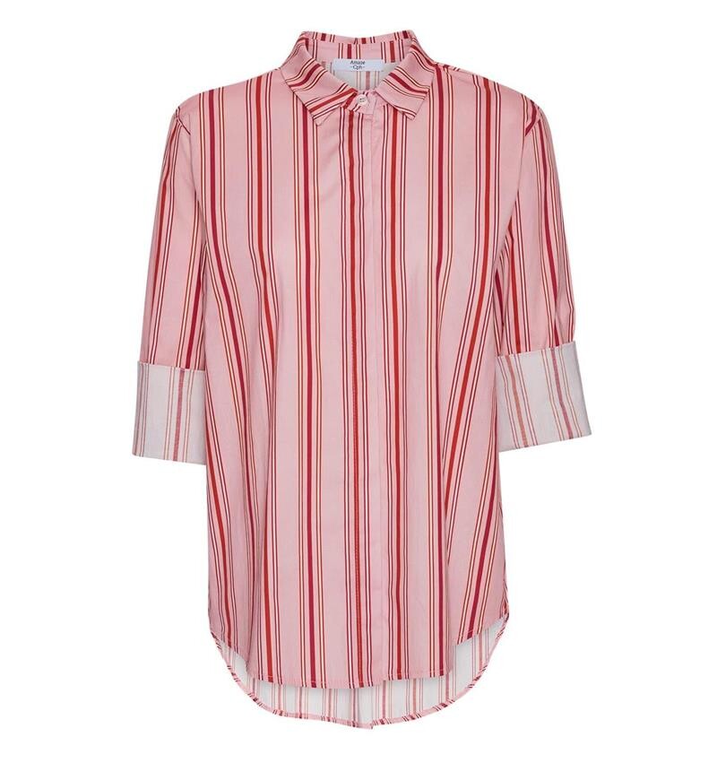 Smuk skjorte fra Amaze Cph. Skjorten er lys rød med striber i røde nuancer. Den er gennemknappet og har en klassisk skjortekrave. Bagpå er stoffet længere end foran og den runde silhuet tilføjer et feminint touch.