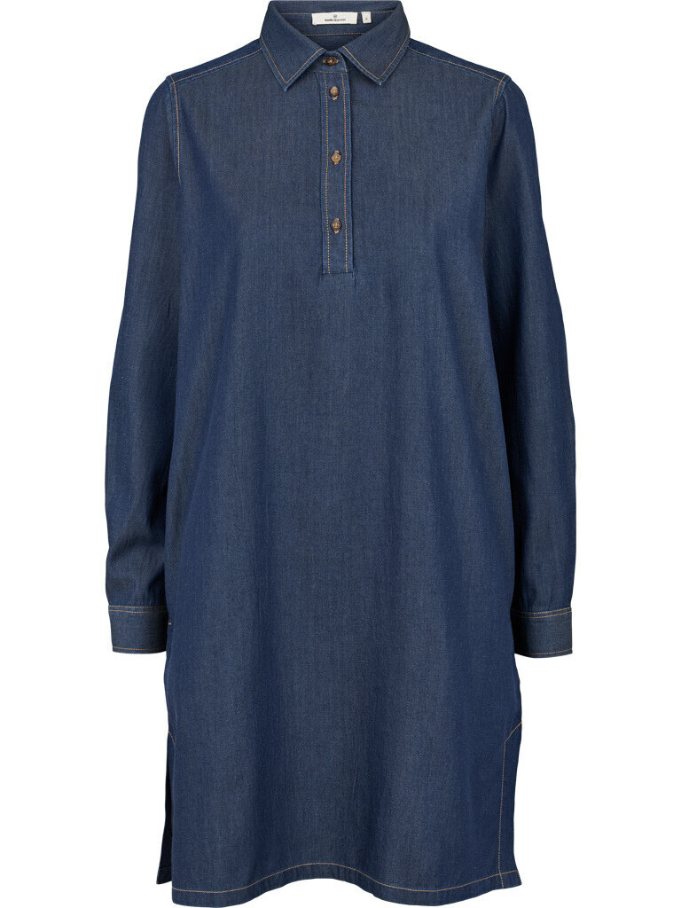 Sød kjole fra Basic Apparel. Blød og behagelig kjole, syet i et let materiale, der føles skånsomt mod huden. Den har et afslappet og løstsiddende snit, som falder naturligt og giver fri bevægelighed hele dagen. Den klassiske polokrave og knaplukning foran tilfører struktur, mens de lange ærmer giver et elegant finish. Diskrete slidser i siderne skaber lethed og en smuk bevægelse, når du går, hvilket giver kjolen et luftigt udtryk.