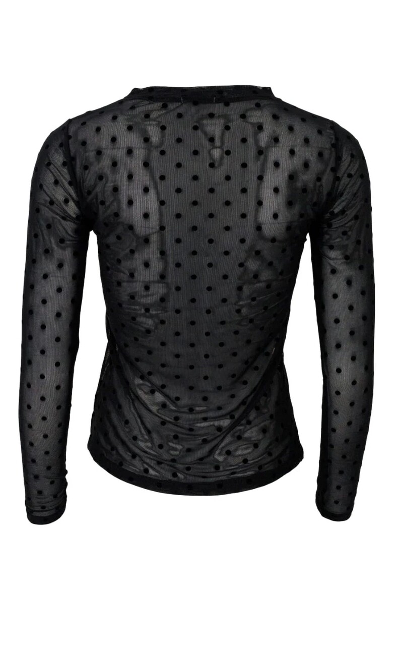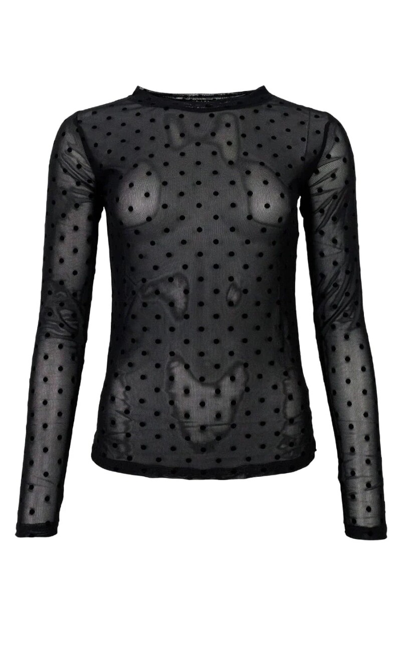 Fin bluse fra Black Colour i mesh stof. Blusen har et sort prikket mønster og tætsiddende design.