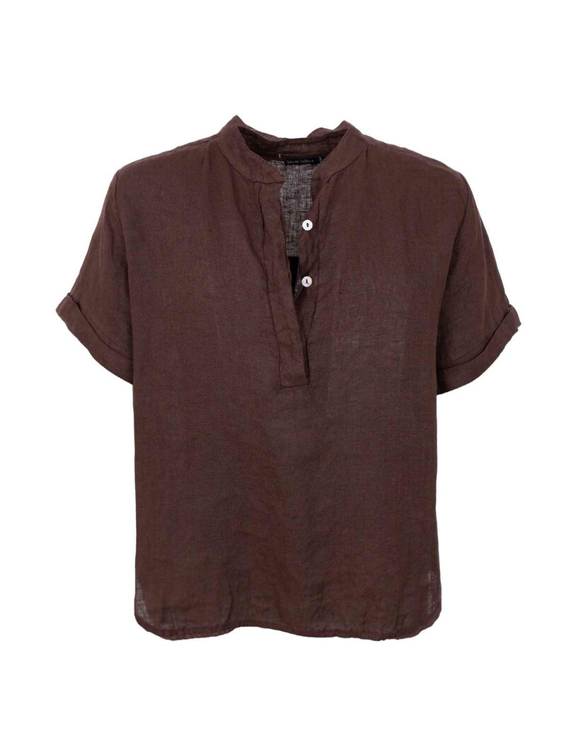 Smart bluse fra Black Colour. Den har korte ærmer med opsmøg og skjulte knaplukninger på brystet. Kinakraven og den løse pasform skaber en afslappet silhuet.