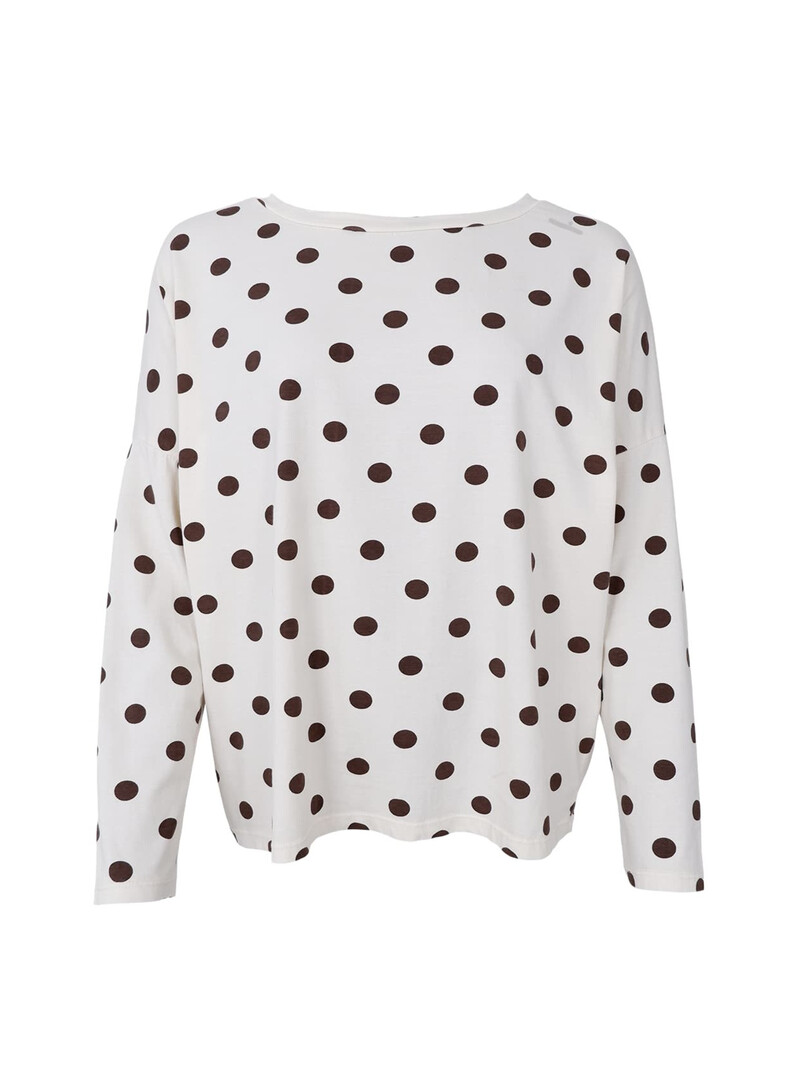 Sød basis bluse fra Black Colour. Blusen har brune prikker, lange ærmer, en rund hals og en afslappet pasform.