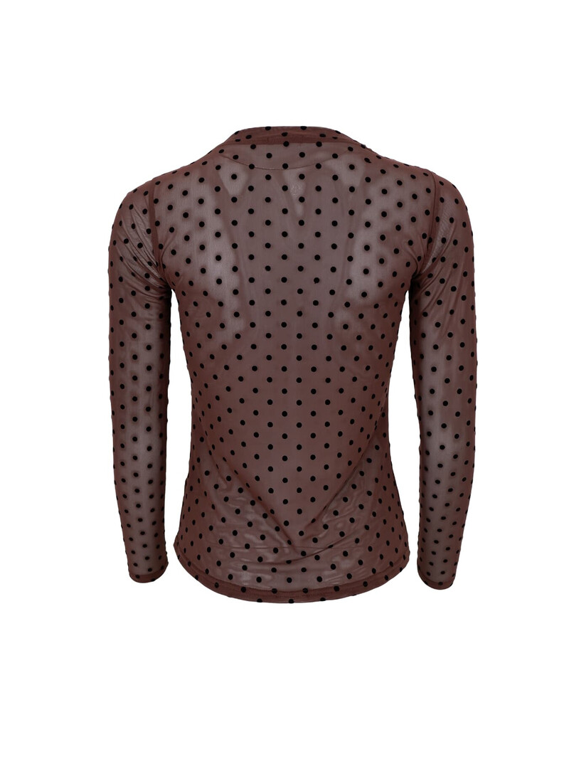 Fin og behagelig langærmet brun meshbluse med sorte prikker, fra Black Colour. Blusen er ideel til lag-på-lag styling, hvor den kan anvendes under diverse bluser eller kjoler. Et must til garderoben.