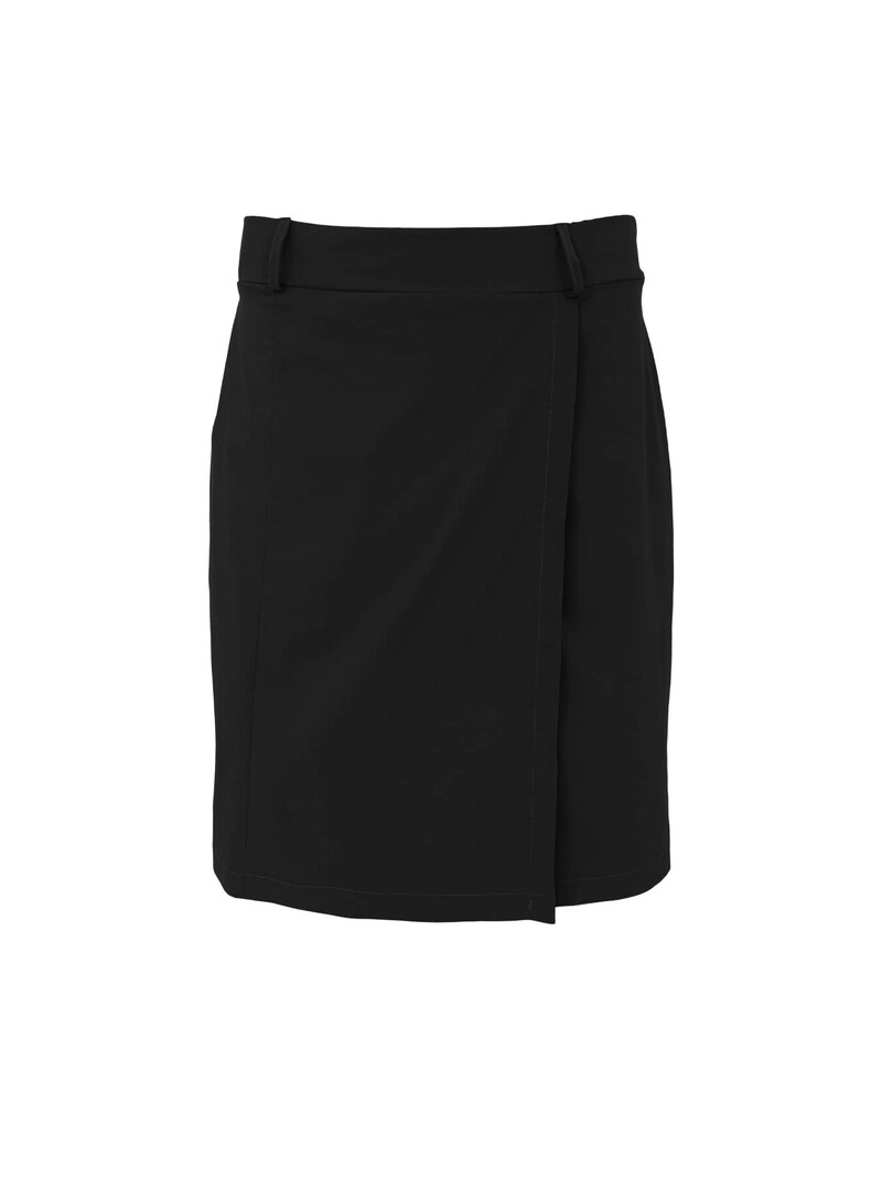 Fineste klassiske nederdel fra Black Colour. Nederdelen er sort o har et overlap, som giver den wrap-looket. Den har bæltestropper i taljen og har knælængde.