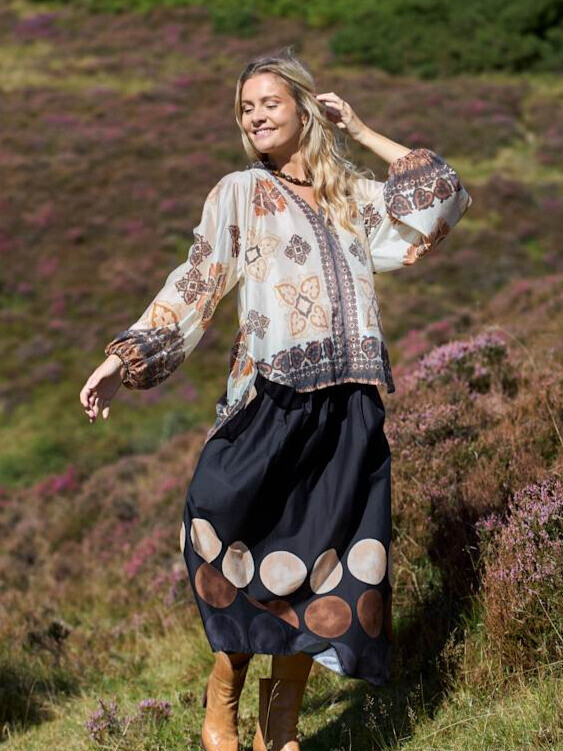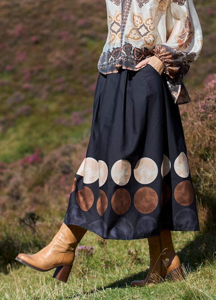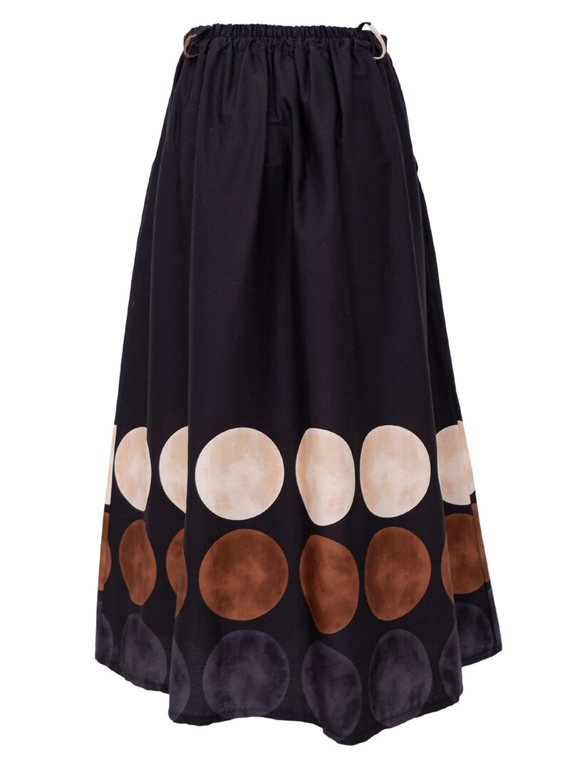 Smuk nederdel fra Black Colour. Den er A-formet, med store printede prikker forneden. Nederdelen har lommer og bæltestropper, samt elastik i taljen bagpå, som gær den yderst behagelig at have på.
