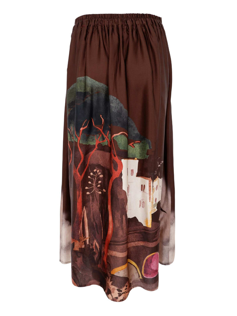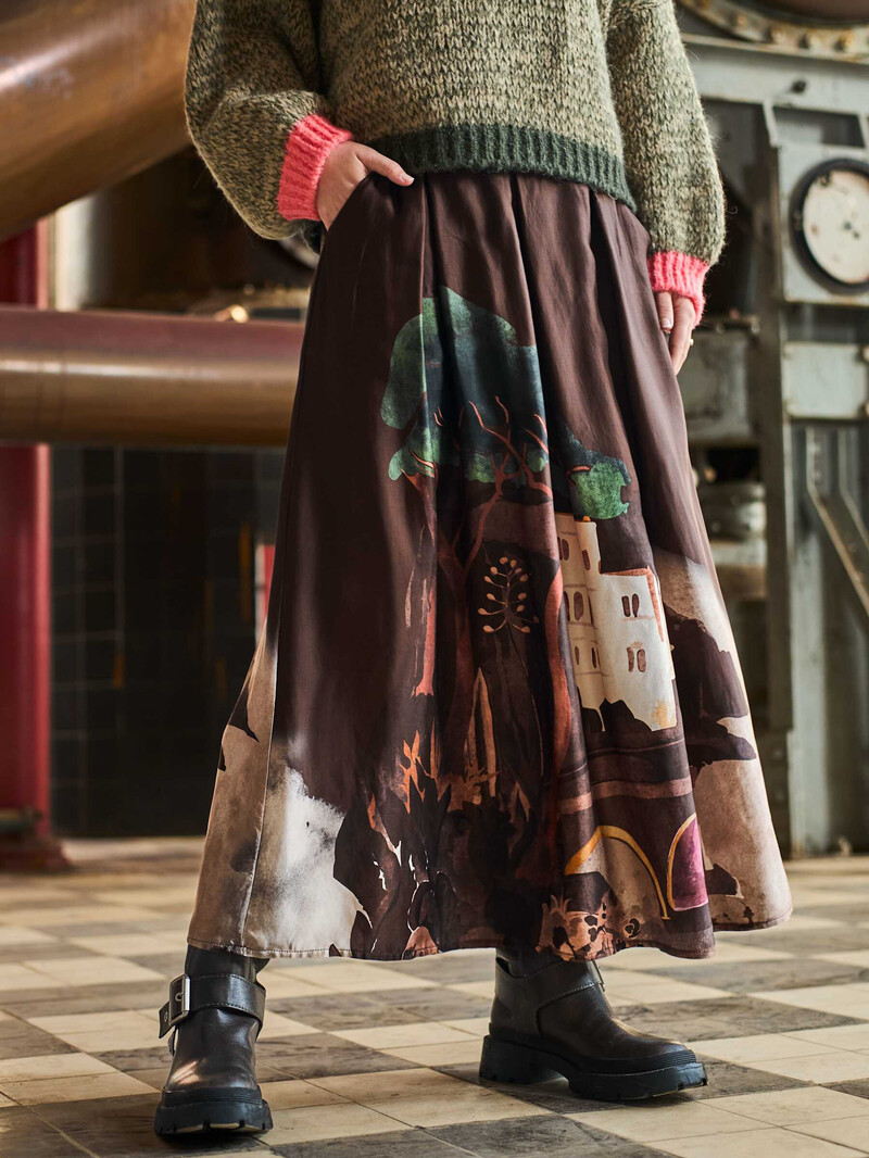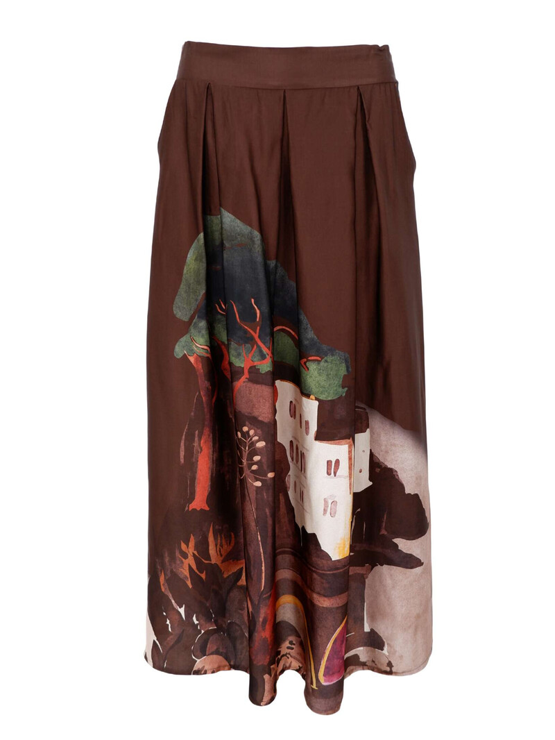 Elegant midi-nederdel fra Black Colour. Nederdelen er fremstillet i en blød, let kvalitet, der falder smukt. Den har elastik i taljen bagpå, lommer, og brede læg foran, som giver et feminint og flatterende snit. Det unikke print, i varme nuancer giver nederdelen et præg af efterår.