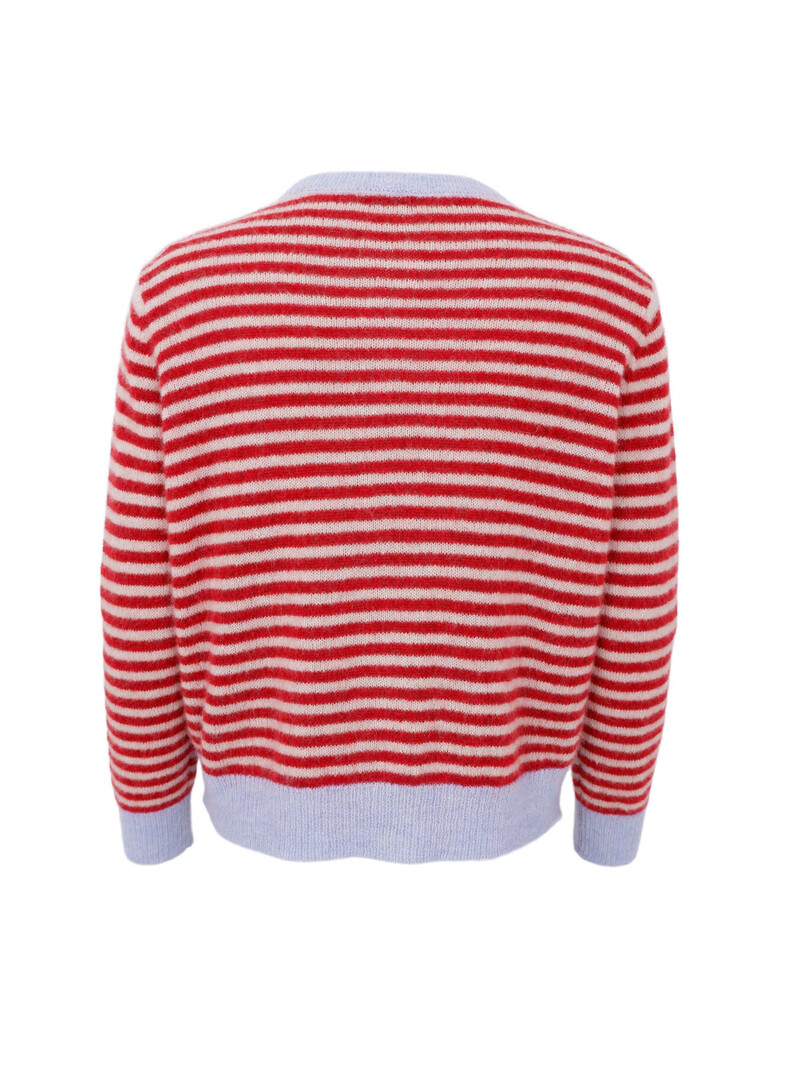 Smuk strikket cardigan fra Black Colour. Den har lange ærmer, rund hals, røde striber og blå manchetter og stribe ned langs knapperne.