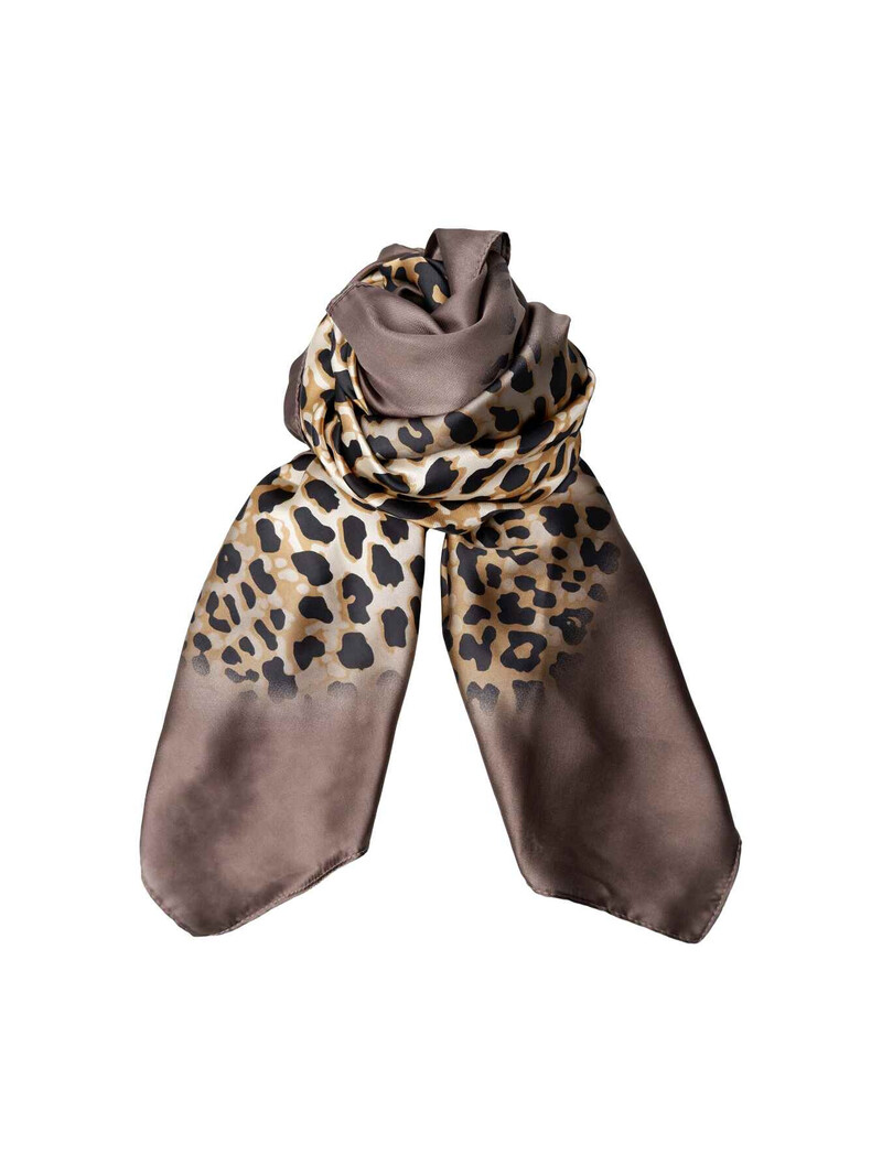 Smukt halstørklæde fra Black Colour. Halstørklædet har et silkelook som gør den ekstra elegant. Den har leo print og en bred brun kant.