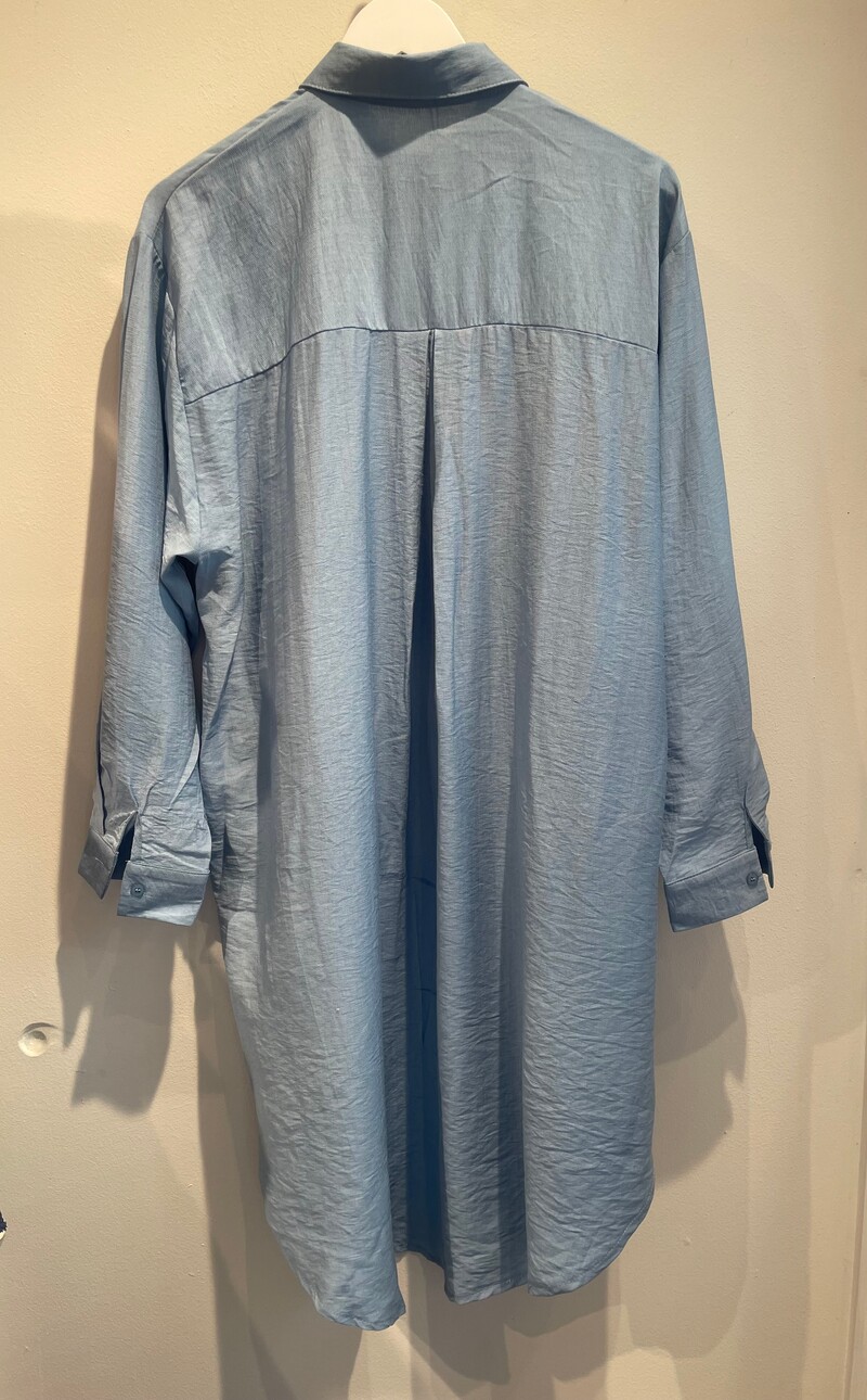 Fineste blå kjole/tunika fra By Lund. Den har lange ærmer, er gennemknappet og har længere stof bagtil, hvilket tilføjer et feminint touch til dit outfit. Foran har den de sødeste broderier som giver en fornemmelse af forår og sommer.