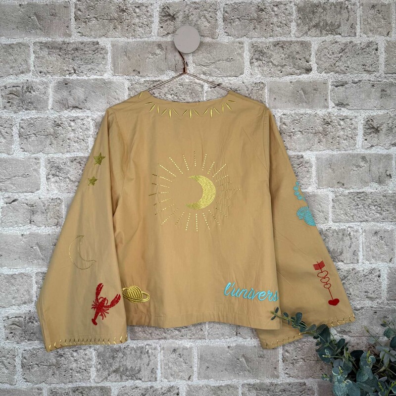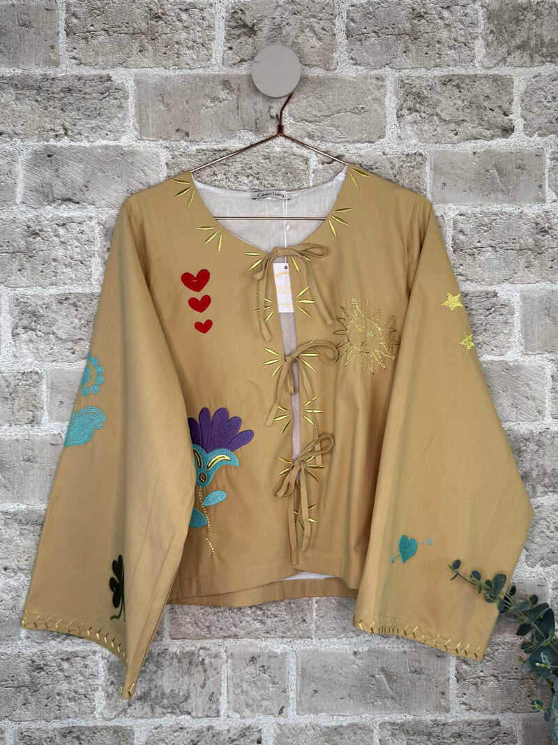 Elegant og feminin skjorte/bluse fra Cabana Living. Den er camel farvet med forskellige broderede motiver i smukke friske farver. I midten bindes den sammen med bånd. Den har en rund hals, brede ærmer og en afslappet pasform.