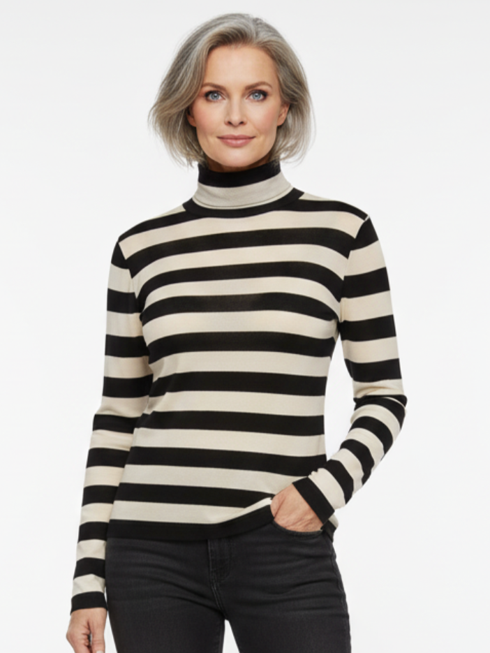 Langærmet bluse med rullekrave fra Co' Couture lavet af lyocell. Blusen har vandrette striber i sort og sand farvet samt en tætsiddende pasform. Super blød og lækker kvalitet.
