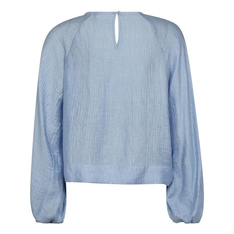 Skønneste bluse fra Co´Couture. Den er i lyseblå med feminin mønster på brystet. Den er i en smuk lyseblå farve med lidt shiny overflade. Ærmerne er lange med lidt ballon facon og elastik ved håndleddet. Den har rund hals med en lille knap i nakken. Blusen er kort.