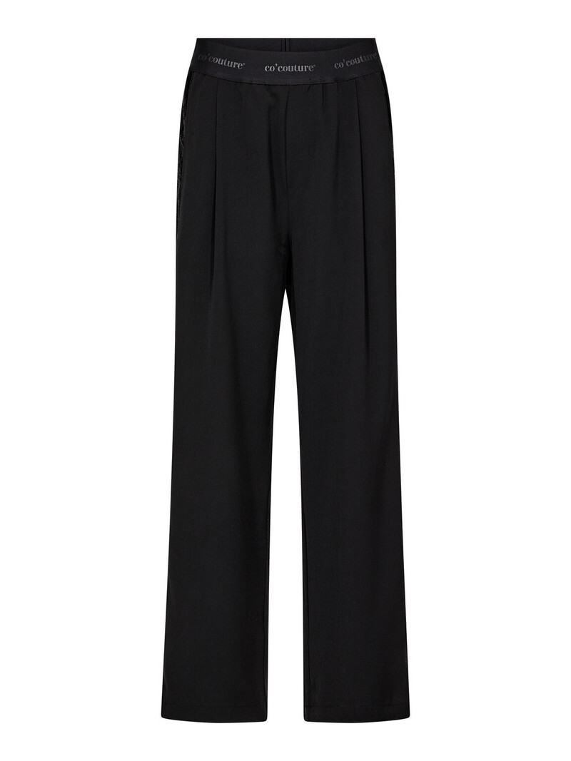 Smart buks fra Co' Couture. Buksen er designet med en elastik kant, og en sort glimmer stribe ned langs begge ben, som tilføjer et eksklusivt look til dit outfit. Bukserne har lige ben, og læg i fronten.