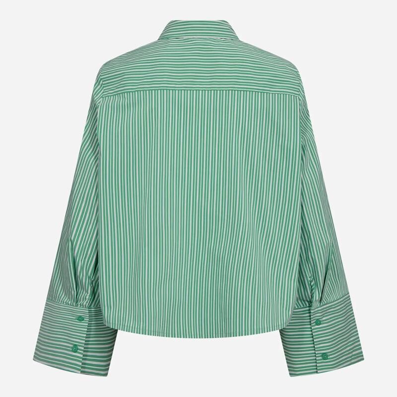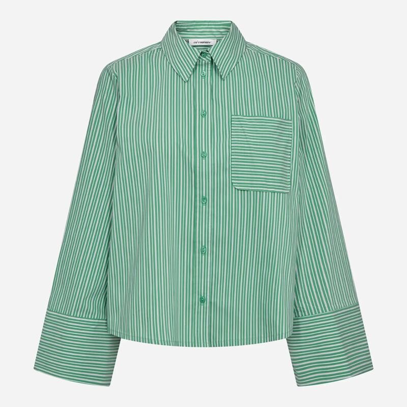 Smukkeste skjorte fra Co' Couture. Skjorten er grøn med smalle hvide striber, en frontlomme uden flap, klassisk skjortekrave og lange løse ærmer som tilføjer et cool og afslappet touch.