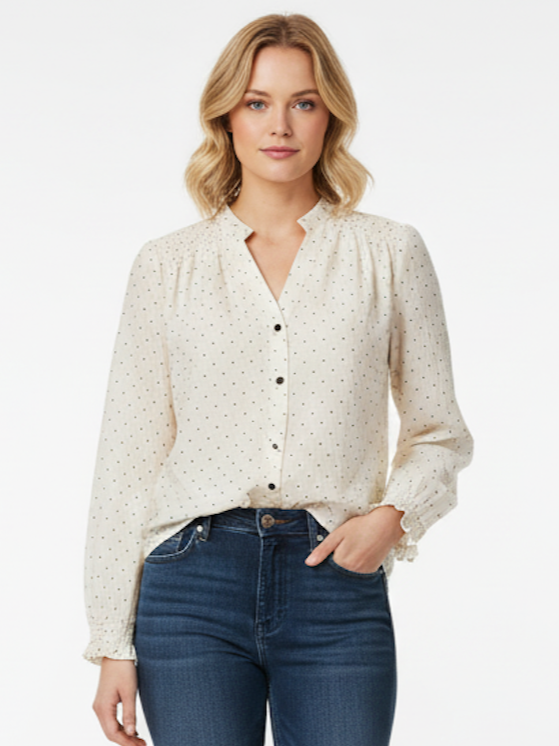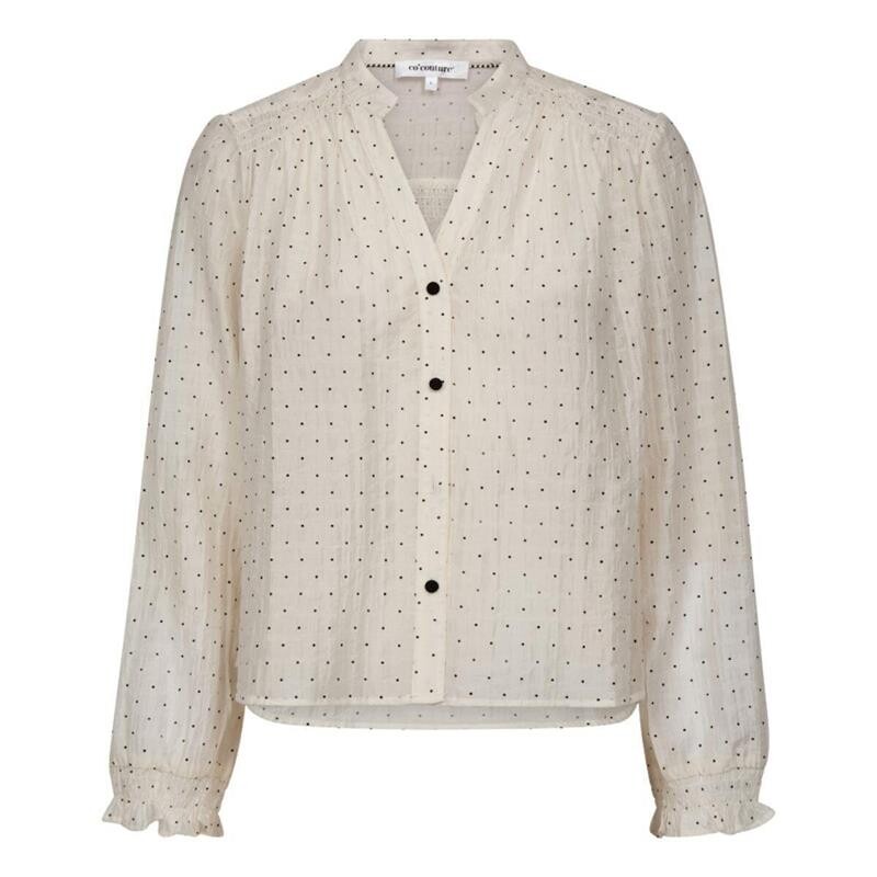 Smuk skjorte i creme med sorte små prikker fra Co' Couture. Skjorten har kinakrave med V-hals, som fortsætter ned i en knapåbning med sorte stofbetrukne knapper. Derudover har den smock detalje på skuldrene og midt på ryggen, samt lange ærmer med smock og flæse forneden. Skjorten er let transparent og længere bagtil end foran.