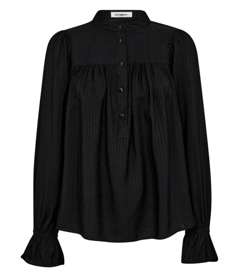 Fin bluse fra Co´Couture. Denne bluse er designet med lange ærmer og flæse for enden, samt en høj krave og små knapper ned langs fronten. Blusen har en syning på tværs af brystet og ryggen som skaber fine detaljer. På skuldrene er der også rynke detaljer som, giver et feminint og sofistikeret udtryk til dit outfit.
