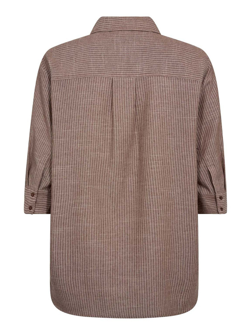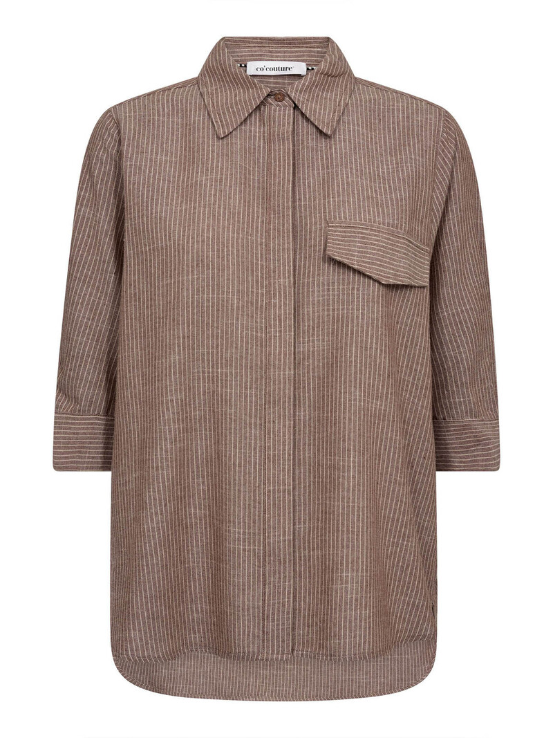 Stribet skjorte fra Co’Couture i en lækker bomuldsblanding. Skjorten er designet i en lys brun nuance med offwhite striber. Skjorten har klassisk skjortekrave, gennemgående knaplukning og en snyde brystlomme. Ærmerne er 3/4-lange med knaplukning, og pasformen er løs og behagelig. Perfekt at style med de matchende Jiho pants i samme farve.