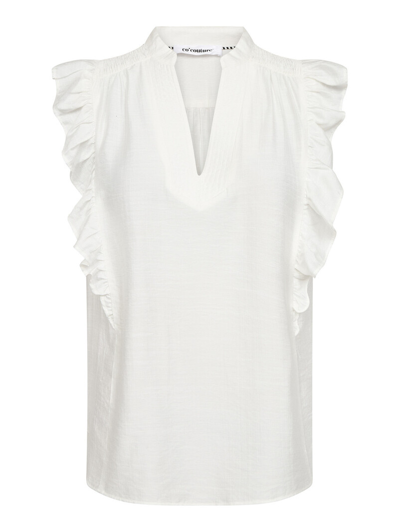 Sødeste sommertop fra Co’Couture i hvid. Toppen har en V-udskæring og dekorative flæser ved skuldrene og ingen ærmer.