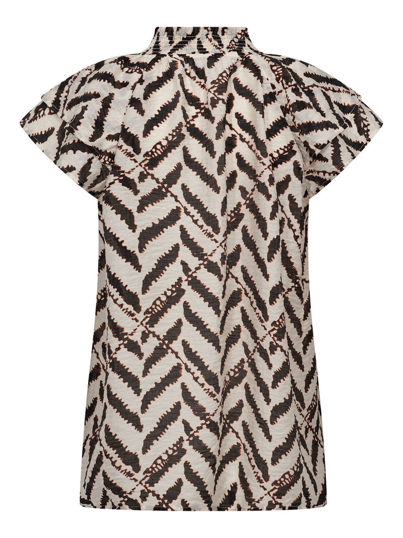 Sødeste top fra Co'Couture. En stilfuld og let top i en smuk, luftig kvalitet med et iøjnefaldende grafisk print i kontrastfarver. Designet har korte, løse ærmer, der giver et feminint og afslappet udtryk, samt en elegant V-udskæring med en let stående krave, som tilfører et sofistikeret touch. Den lige pasform gør toppen behagelig at have på og nem at style – både til jeans for et casual look eller til en nederdel for en mere feminin stil. En alsidig favorit, der løfter enhver garderobe.
