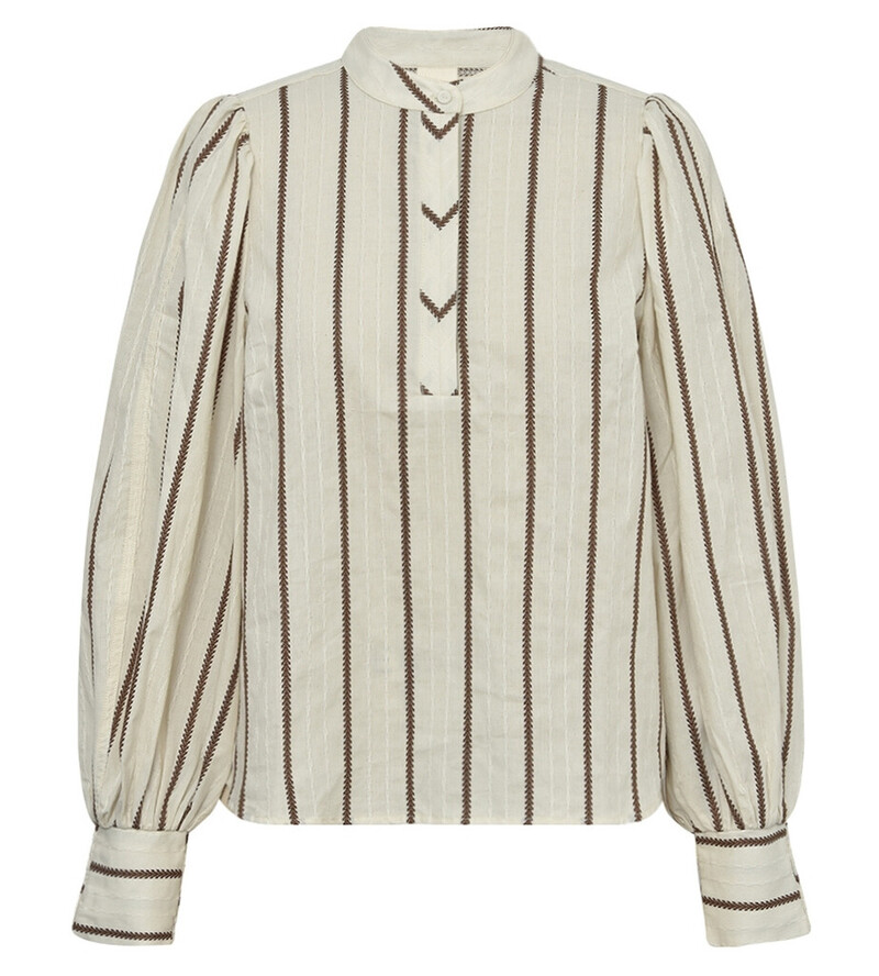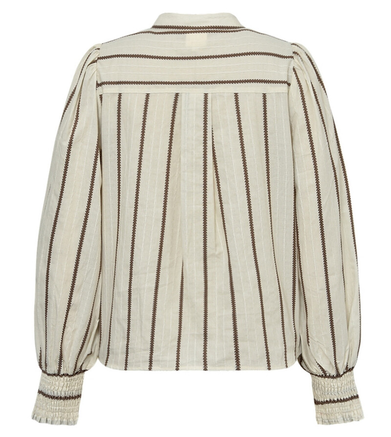 Fineste bluse fra Gossia. Blusen har lange brede ærmer med smock for enden, samt en smule puf ved skulderen. Den har skjulte knaplukninger foran og en kinakrave. Blusen er råhvid med brune striber.