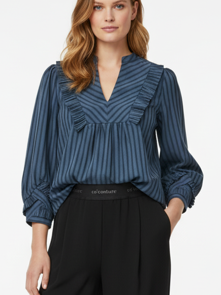 Smukkeste bluse fra Gossia. Blusen er blå med mørke striber. Den har en v-udskæring og flæsedetaljer foran, som giver blusen et feminint udtryk. Ærmerne har også fine detaljer med flæser.
