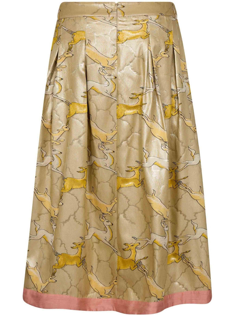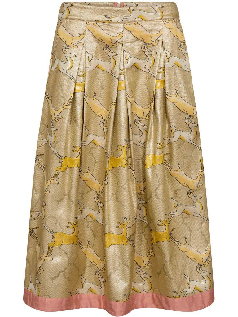Fineste nederdel fra Gossia. Smuk nederdel i en let skinnende kvalitet med et elegant fald. Modellen har læg foran, som giver vidde og bevægelse, samt en fast linning for en flatterende pasform. Nederdelen er dekoreret med et grafisk mønster af springende hjorte i gyldne og cremefarvede nuancer på en varm, beige baggrund. Nederst afsluttes designet med en kontrastkant i en dæmpet rosa tone, der tilfører et sofistikeret touch. Den lukkes bagpå med lynlås.