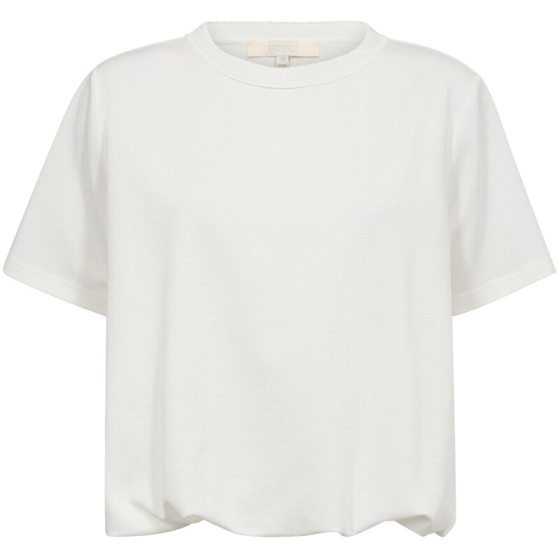Kort feminin T-shirt med flot ballon-effekt fra Gossia. En elegant og stilfuld T-shirt med en smuk ballonform ved taljen, der fremhæver figuren på fineste vis. De enkle detaljer skaber et eksklusivt udtryk og en pasform, som både er afslappet og elegant.