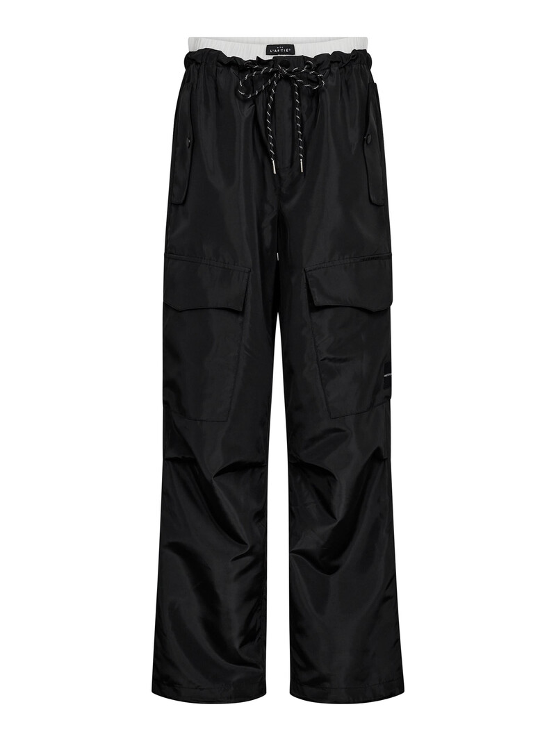 Smarte sorte cargo bukser fra Haute L´Amitié der kombinerer funktionalitet og streetwear-stil. Bukserne er fremstillet i et let, glansfuldt materiale. De har en afslappet, loose pasform med justerbar elastisk talje og snøre, hvilket sikrer maksimal komfort og fleksibilitet. Store cargolommer med klap på begge ben samt sidelommer med knaplukning giver rigeligt med opbevaringsplads og tilføjer et funktionelt look.