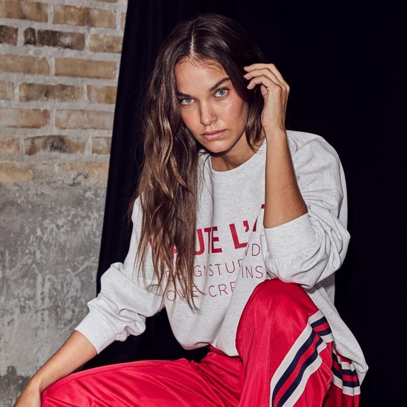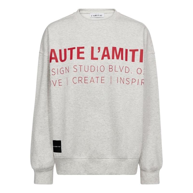 Supercool sweatshirt i en lækker blød bomuldsblanding fra Haute L'amitié. Sweatshirten er meleret lysegrå med rødt logo samt tekst trykt på fronten. Derudover har den rund halsudskæring og lange ærmer med drop-down skuldre og kant forneden samt nederst på kroppen. Sweatshirten har et lækkert oversize fit..