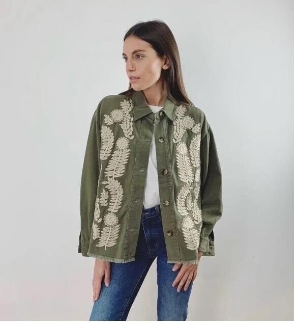 Smukkeste jakke fra Lecoco. Jakken er grøn og har en klassisk skjortekrave. Den er gennemknappet, og bundkanten giver en cool effekt. Foran har den de fineste broderier, som giver et præg af forår og sommer til dit outfit.