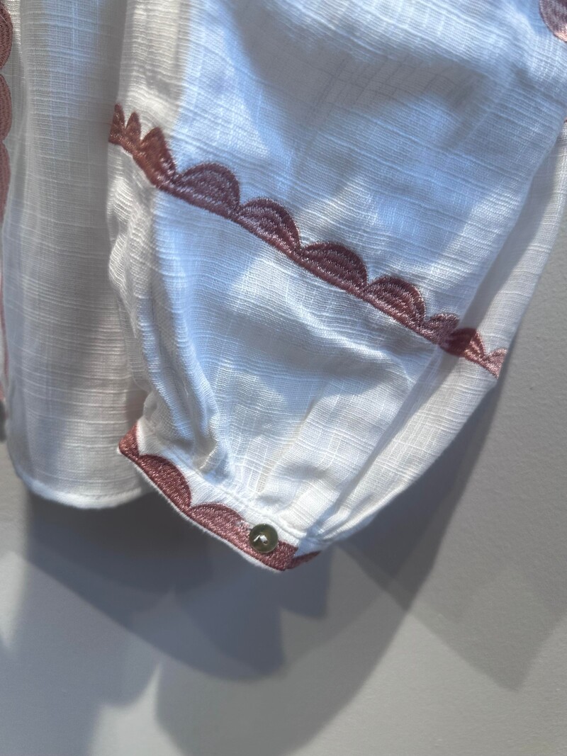 Skønneste hvide boheme-inspireret skjorte fra Lecoco. Skjorten har lange ærmer med balloneffekt for enden. Langs syningerne er der smukke broderede mønstre som tilføjer en feminin effekt. Den har en bred hals med et brunt bindebånd. Skjorten har en afslappet pasform.