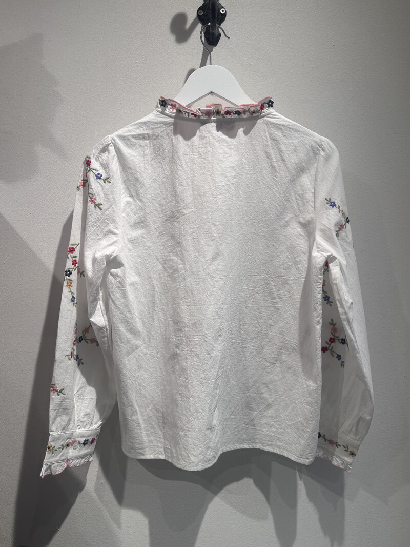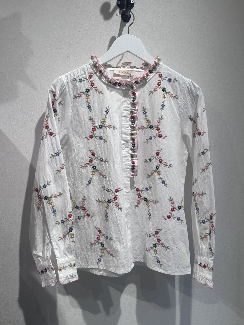 Sødeste blomstrede skjorte fra Lecoco. Skjorten er hvid med broderede bloster i smukke lyse forårsfarver. I kraven, ned langs knaplukningerne og på ærmerne, er der flæser, som tilføjer en feminin effekt til dit outfit.