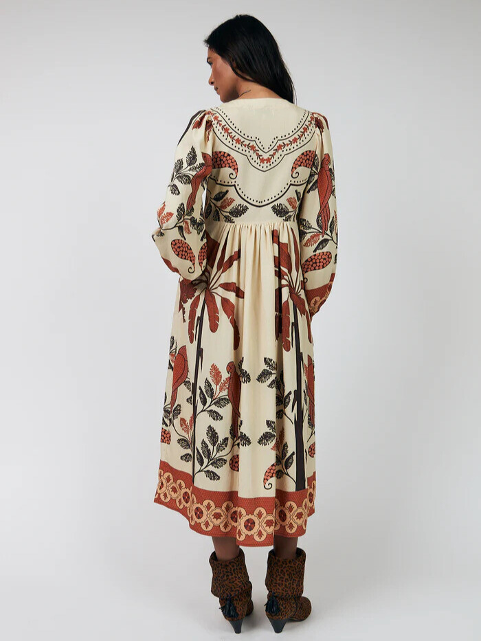 Smukkeste kjole fra Lollys Laundry. Det er en drømmende og kunstnerisk kjole i varme nuancer med et rigt, detaljeret print. Det bohemeinspirerede design giver kjolen en helt særlig karakter, mens den løse, feminine silhuet med knaplukning foran og et let fald sikrer høj komfort – perfekt til både hverdag og fest.