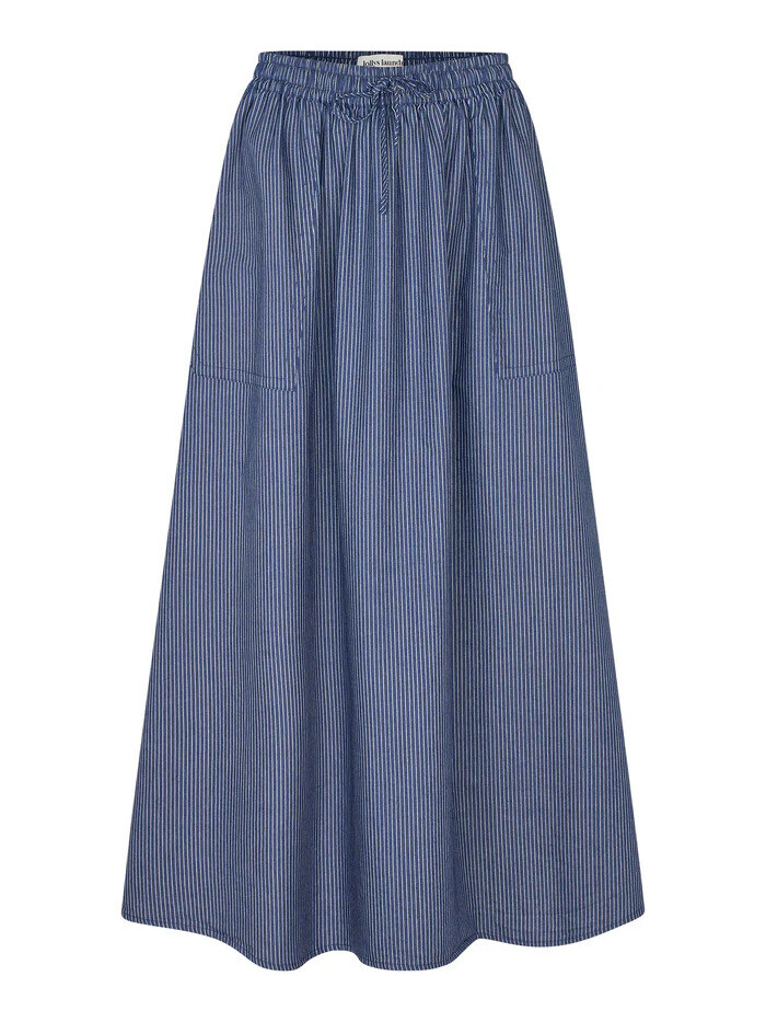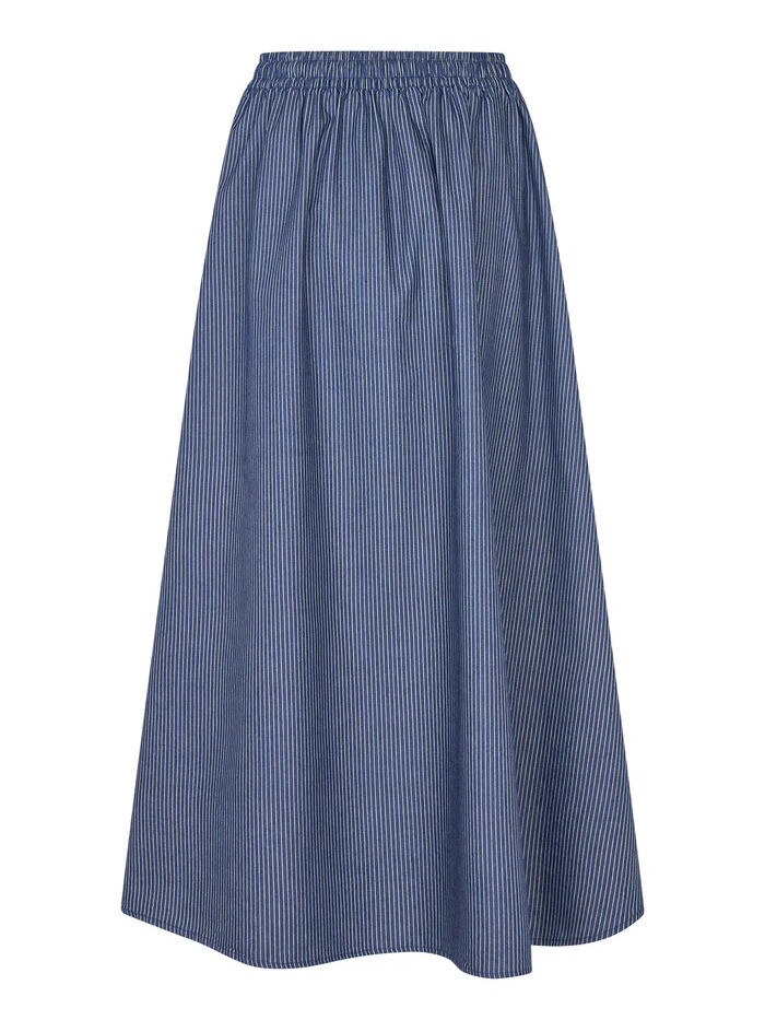 Smart mørkeblå maxi nederdel fra Lollys Laundry. Nederdelen kan bruges sæson efter sæson. Den forener komfort, funktionalitet og en flatterende pasform, mens de diskrete striber i mørkeblå og hvid giver et udtryk, der er både klassisk og moderne.