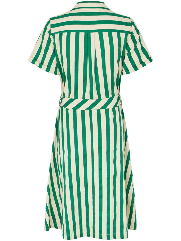 En charmerende og tidløs skjortekjole med et moderne stribet design fra Lollys Laundry. Kjolen er lavet af en blød og behagelig kvalitet, perfekt til både hverdag og særlige lejligheder. De diagonale striber foran skaber et flatterende og iøjnefaldende look, der giver kjolen et unikt twist.
