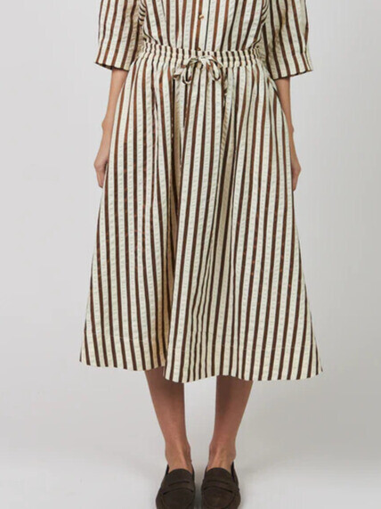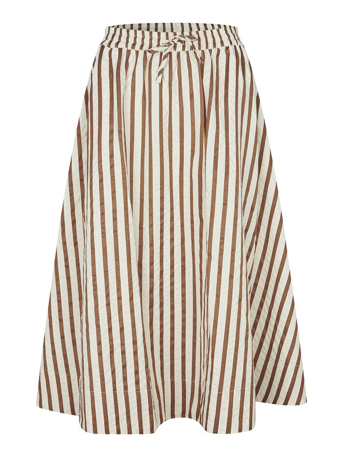 Smart feminin nederdel fra Lollys Laundry. Det er en let og feminin nederdel med smukke striber og lommer i siderne. Den elastiske talje med bindebånd sikrer en behagelig pasform, mens den vidde silhuet tilfører et elegant og charmerende look.