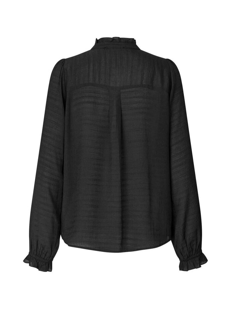 Smuk sort skjorte med tone i tone mønster fra Lollys Laundry. Skjorten er designet i en skøn rayon blanding og er let transparent, med de fineste blonde detaljer foran. Den har kinakrave i form af en kort flæse, og lukkes med knapper. På fronten er der lodrette læg for detaljen. De lange ærmer er afsluttet med en elastikkant og flæse.