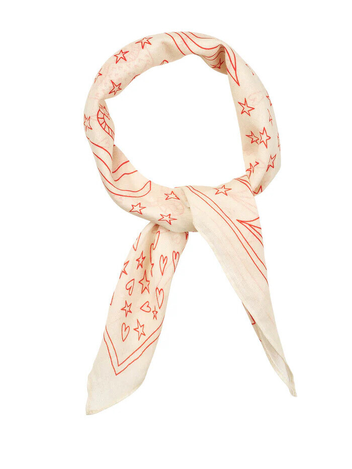 Sødt tørklæde fra Lollys Laundry. Tørklædet er fantasifuldt og dekorativt, prydet med delikate, håndtegnede illustrationer, som tilsammen fortæller en lille historie. Det kan styles på utallige måder – om halsen, i håret eller som et fint detaljeret touch på tasken.