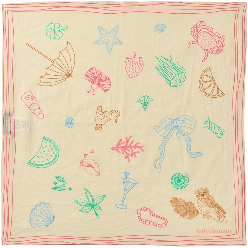 Fineste tørklæde fra Lollys Laundry. Et let og legende tørklæde med et kunstnerisk udtryk, perfekt til at give dit outfit et personligt twist. Tørklædet har en blød, cremefarvet base indrammet af en fin rød kant, som giver et klassisk og elegant look. Designet er dekoreret med små, farverige illustrationer i en enkel stregstil og sommerinspirerede motiver.